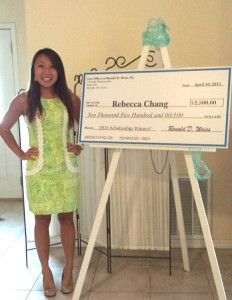 Ms. Rebecca Chang of Plano, Texas entered our 2015 Ronald Weiss Scholarship competition, and was chosen by Mr. Weiss as having submitted the winning essay. Ms. Chang did a wonderful job! Congratulations to Rebecca! We would also like to thank all of you who entered the competition. Don't give up as we are holding the scholarship competition again in 2016.