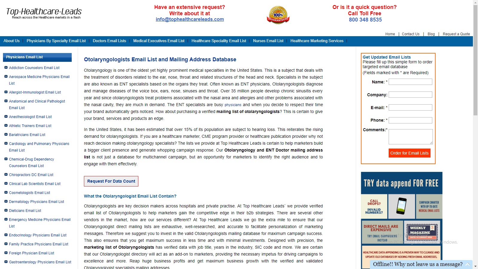 We at Top HealthCare Leads suggest you to invest in our valid Otolaryngologists database to get the maximum campaign success in less time and with minimal investments. Do not hesitate to make the smart move. Use our cost-effective healthcare database to amplify sales and revenue. Request quotes now!!!