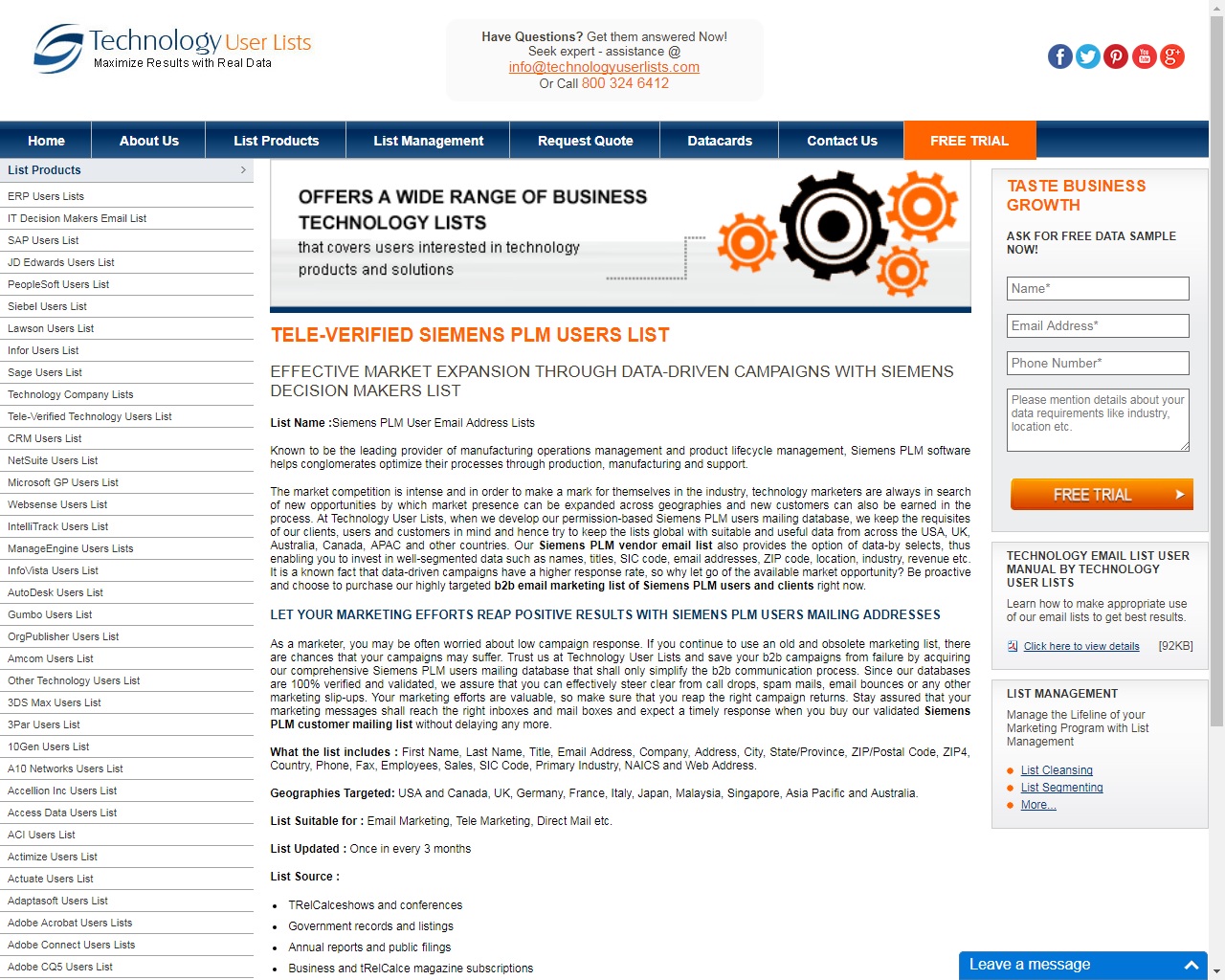 As a global mailing lists provider, Technology User Lists can empower marketers with highly targeted & authentic Siemens PLM user data that can shorten sales cycles while maximizing lead capture, thereby accelerating business revenues. Powered by high deliverability feature, let our opt-in B2B lists help you achieve high ROI & foster brand relationships with customers & prospects through personalized multi-channel marketing campaigns.